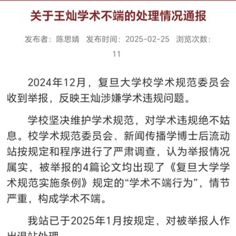 2月25日中午,复旦大学新闻学院发布了《对于王灿学术怪异的处理情况通报》:2024年12月,复旦大学校学术要领委员会收到举报,反应王灿涉嫌学术违章问题。学校刚硬看重学术要领,对学术违章毫不姑息。校学术要领委员会、新闻传播学博士后流动站按限定和要领进行了严肃造访,合计举报情况属实,被举报的4篇论文均出现了《复旦大学学术要领实施条例》限定的“学术怪异看成”,情节严重,组成学术怪异。我站已于2025年1月按限定🦄九游下载中心_九游游戏中心官网,对被举报东谈主作出退站处理。