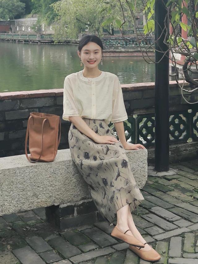 圆领白衬衫号称“白蟾光”,领有不劳作的文艺氛围,捏条印花裙进行搭配,一看就很有故事感。