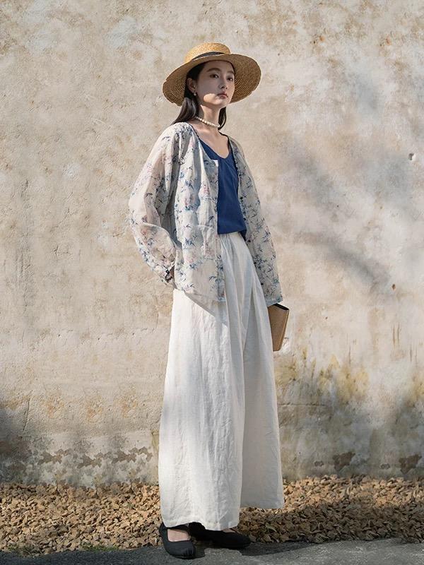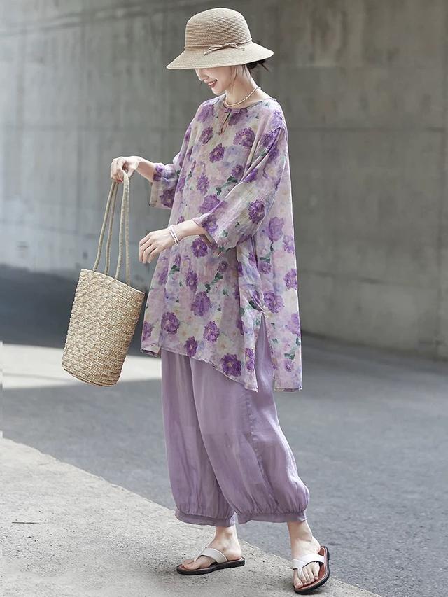 长款的印花衫配阔腿裤,组合成了一起慵懒结节,但又让东说念主忍不住念念要蚁合。