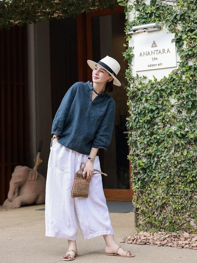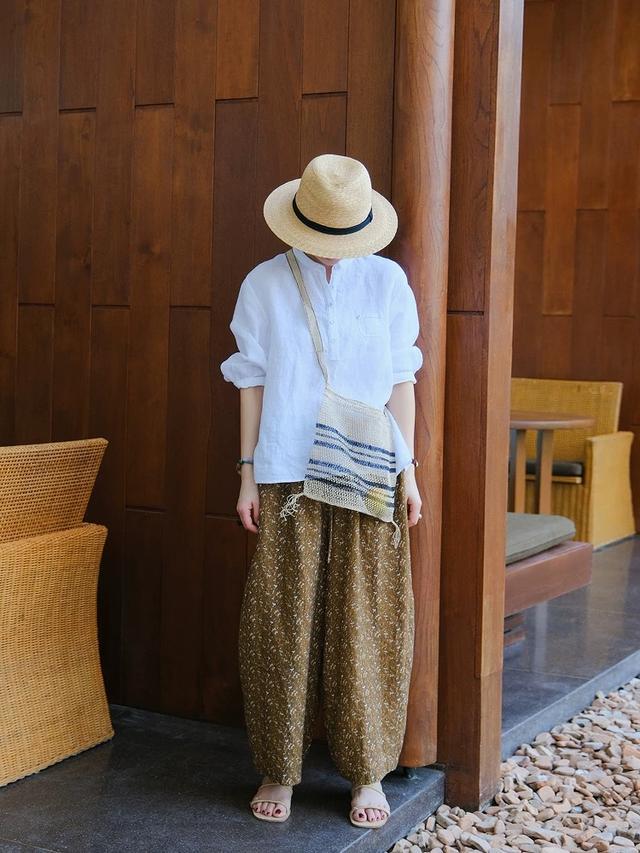 亚麻衬衫配弯刀裤,戴上凉帽和草编包,超有放肆感。