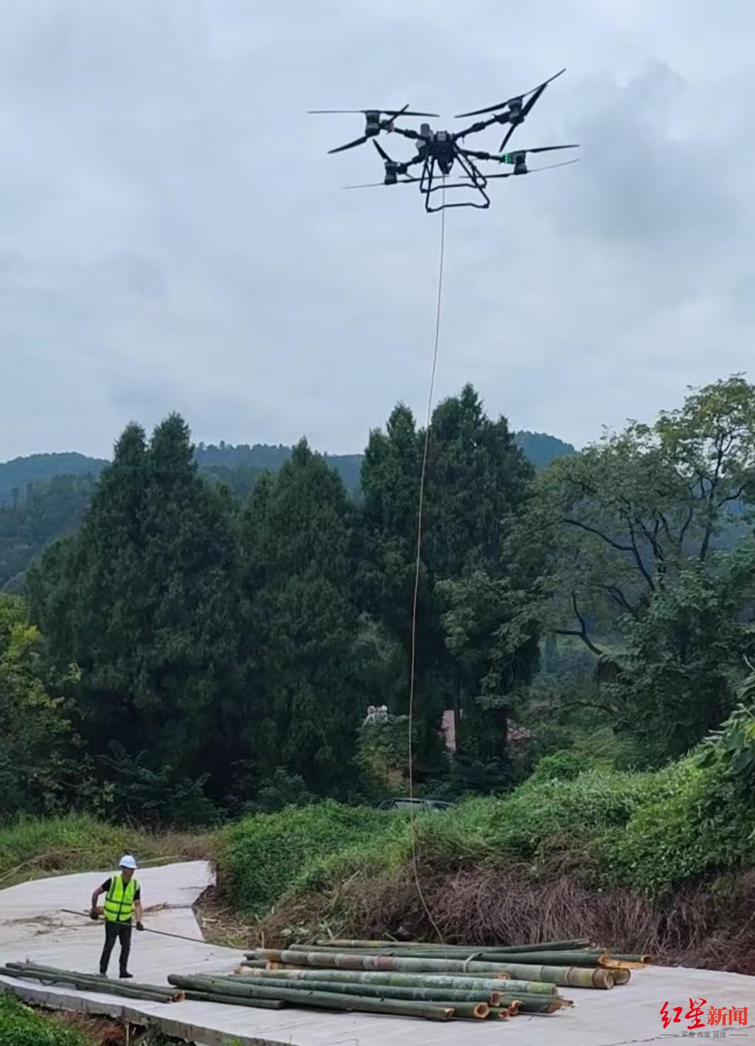 陈文建准备用无东谈主机吊运竹子。受访者供图