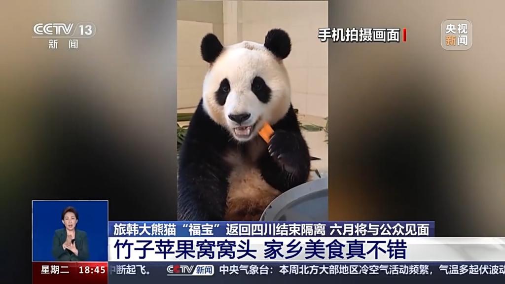 现时,“福宝”依然罢休拆开,插足行将与公众碰眼前的过渡期,并将于六月份与公众碰面。“福宝”平时的生活状态怎么呢?流程基地的允许,总台记者走进了福宝的家,一齐去望望。